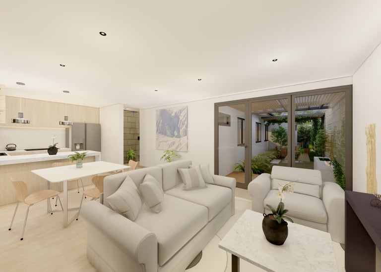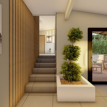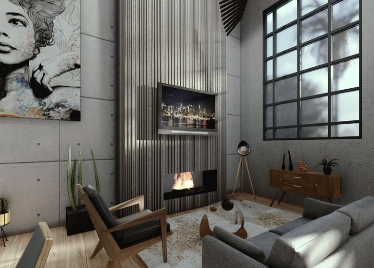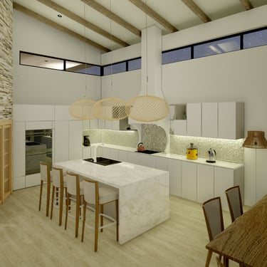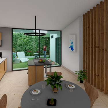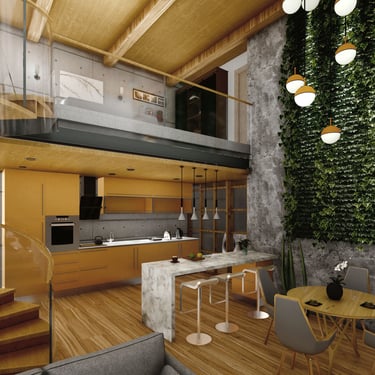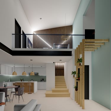 Intervención interior enfocada en potenciar la amplitud y la iluminación natural mediante espacios abiertos y doble altura. La propuesta integra materialidad cálida, detalles industriales y elementos verticales que aportan carácter y textura, generando un ambiente contemporáneo, acogedor y funcional.